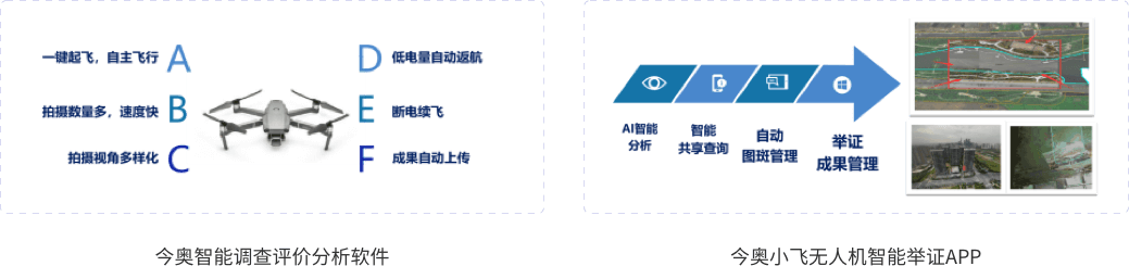 今奧科技針對年度變更調查和三調外業舉證工作中的難點及痛點研發集智慧調查與核查于一體的智慧解決方案。該方案由航線規劃軟件、智能舉證APP、調查評價分析軟件三部分組成,通過應用先進無人機技術、AI智能分析技術實現多圖斑、大圖斑自動化快速舉證調查,成果智能核查分析,從而降低舉證難度、減少舉證工作量,將舉證效率提高5倍以上。